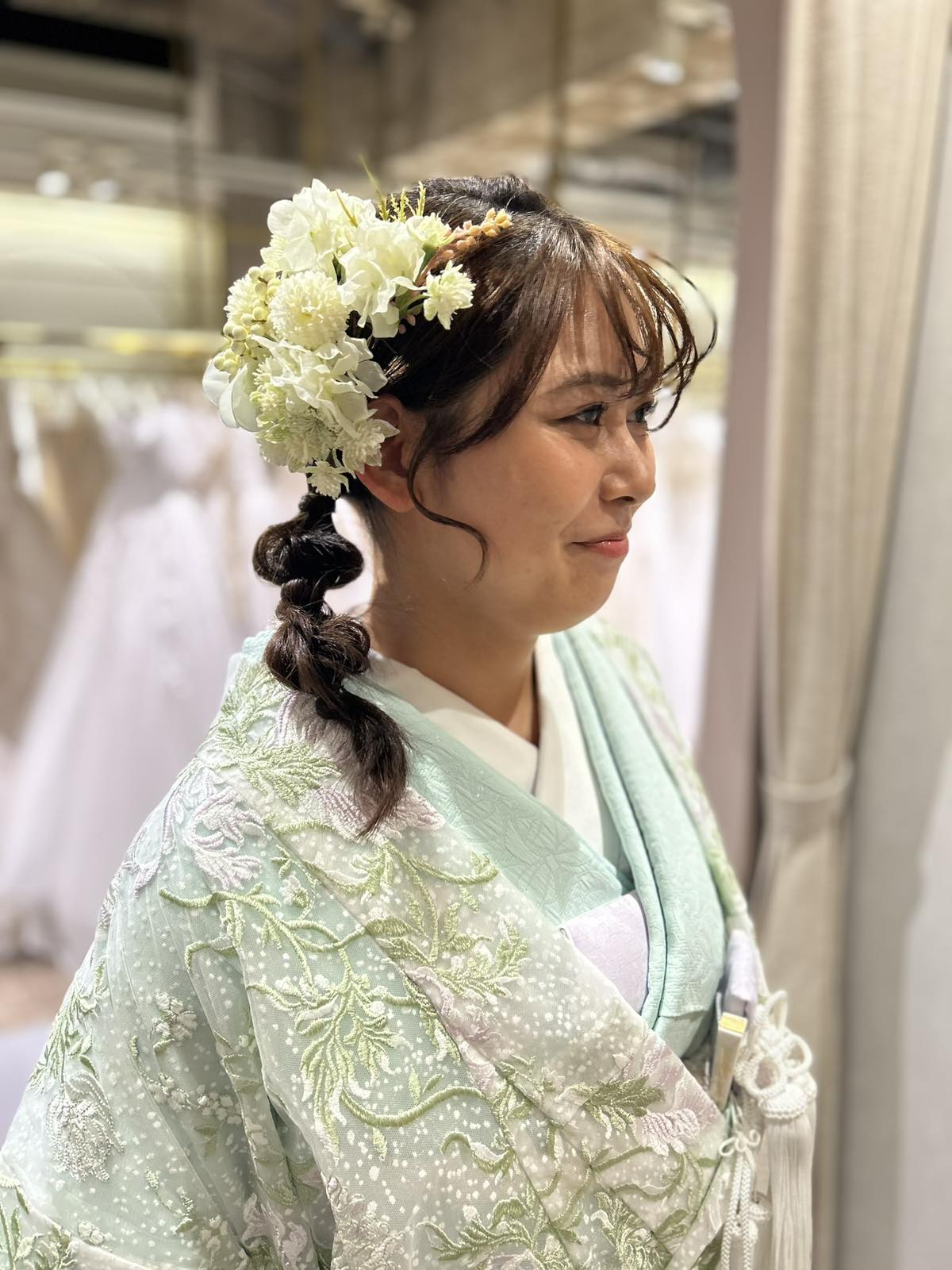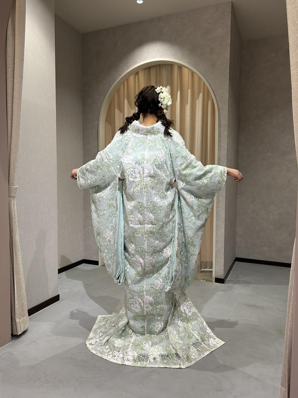 透明感あるグリーンを基調に、可憐なピンクの花柄レースをふんだんにあしらった色打掛です。淡く柔らかな色彩が清らかな印象を与え、花々が咲き誇る姿はまるで春風に包まれた花畑のよう。洗練された可憐さが魅力の一枚です。