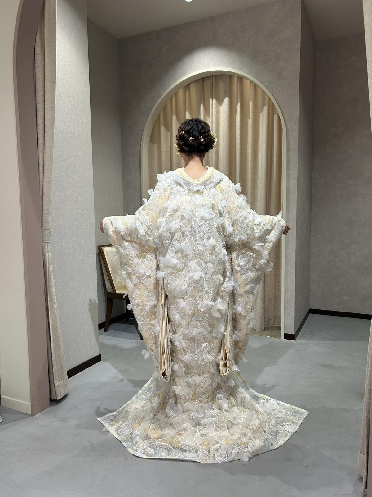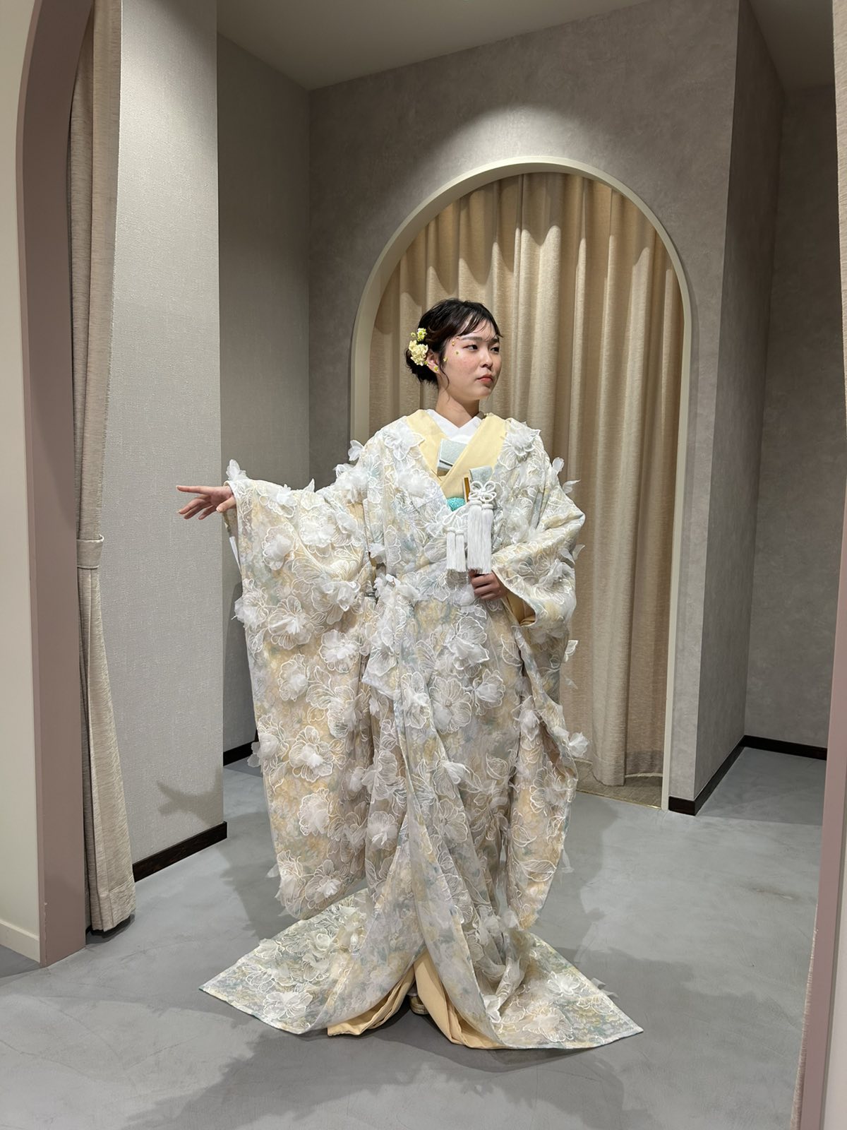 淡いイエローを基調に、繊細な立体レースの花々を贅沢にあしらった可憐な打掛です。
